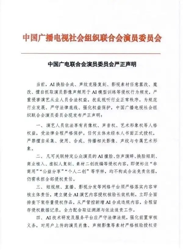 中国广播电视社会组织联合会演员委员会发布声明,明确禁止AI换脸和声纹克隆等侵权行为,并要求平台加强审核和核验机制,以保护演员的合法权益。