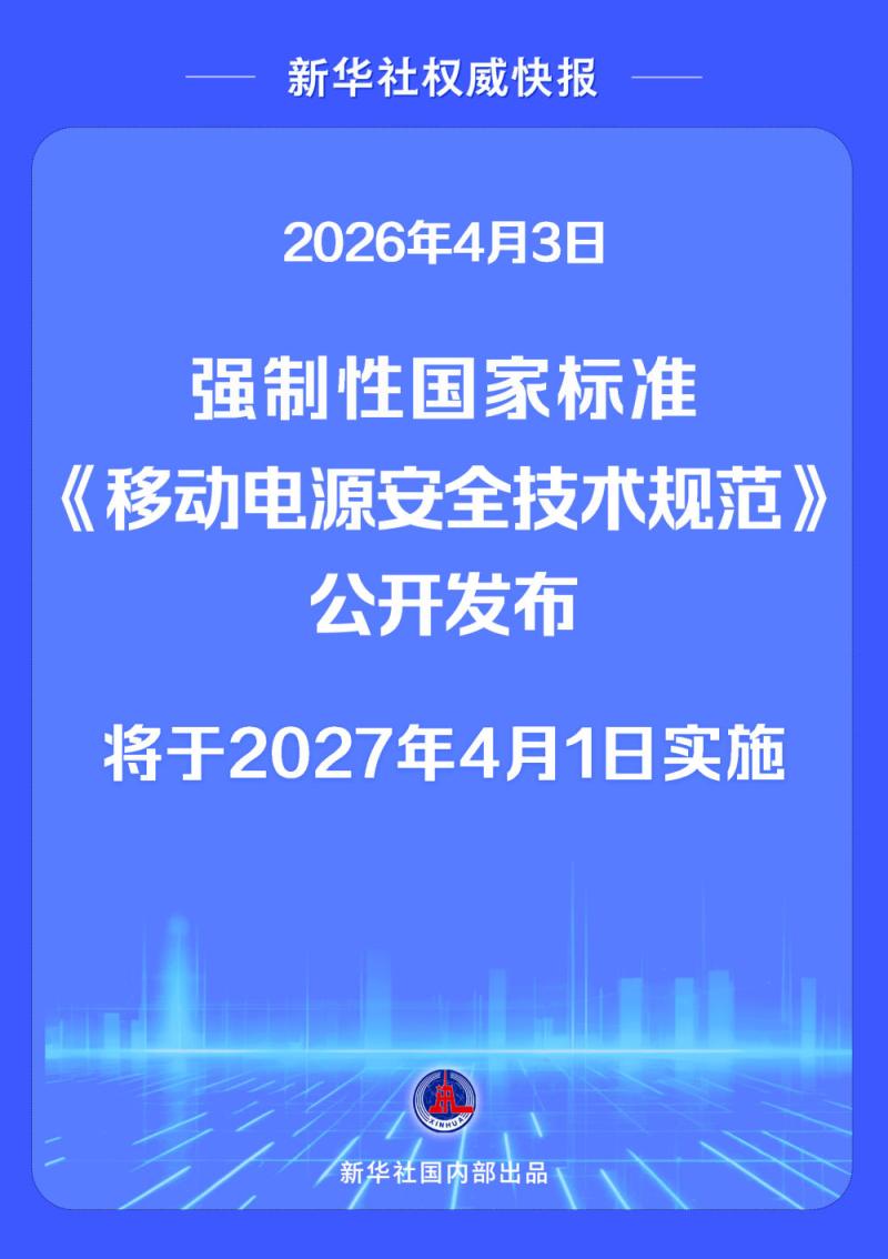 2026年4月3日,强制性国家标准《移动电源安全技术规范》公开发布,将于2027年4月1日实施。新标准提出多项要求,进一步强化包括充电宝在内的移动电源产品安全水平——